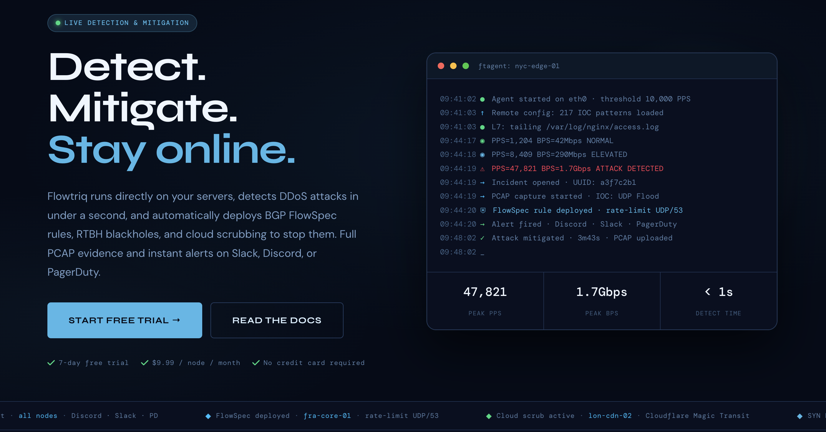 Sub-Second Detection and Classification: Flowtriq's agent analyzes packets at the NIC level, classifying over eight attack types like SYN floods or HTTP floods in under a second using pattern matching against 642,000+ threat indicators. In a marketing context, this prevents site crashes during peak ad campaigns; for instance, if a viral email blast triggers anomalous traffic, the system auto-identifies and mitigates without human intervention, keeping conversion funnels alive.